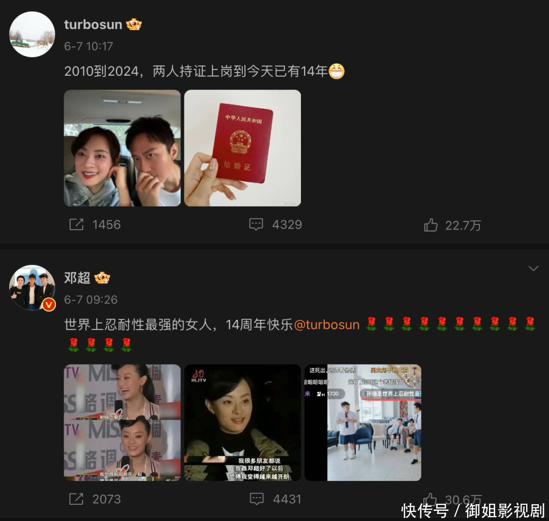 2010年领取娶妻证,本年的6月7日邓超和孙俪诀别发出微博,祝领证14周年雅瞻念。